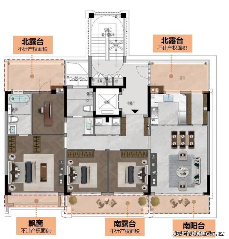 以建面约152㎡(部分)的中叠为例,不仅设计南北两大双露台,观景生活晾晒功能两不误,还将北露台进深从1.75米扩大到2.85米,外拓的1.1米空间,足够摆上桌椅,一本书,一杯茶,享受下午落日时光。