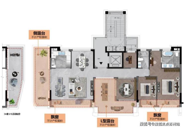 以建面约143㎡的平墅为例!均位于整个南地块的两侧,为了进一步放大瞰湖视野,约18.9米宽厅,除L型露台,还增设了侧边露台,享受墅居的延展。